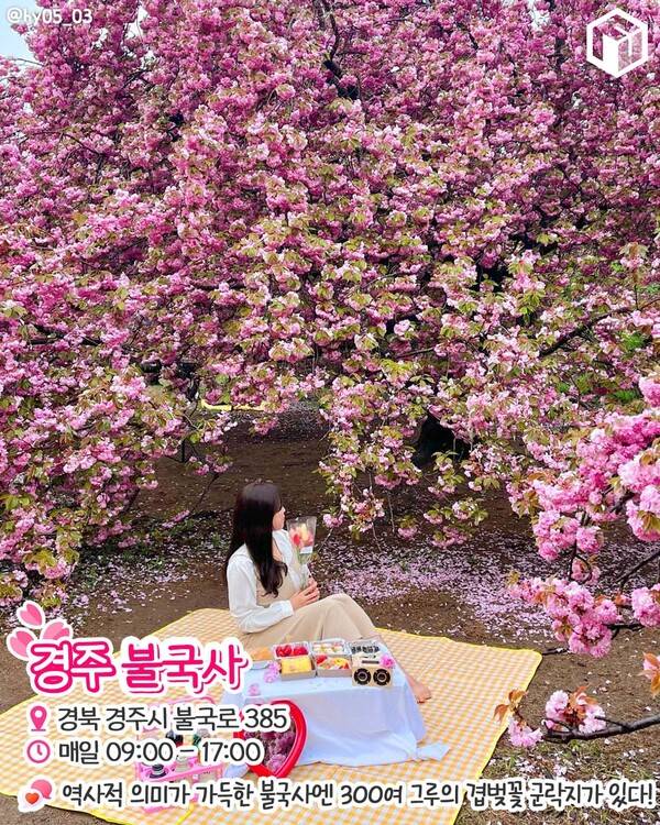 경주 겹벚꽃 명소로 유명한 불국사에서는 벌써 겹벚꽃 개화 소식이 전해지고 있습니다. 4월 셋째주에서 넷째주 사이 불국사를 방문하면 풍성하게 만개한 겹벚꽃을 볼 수 있을 것으로 보이는데요. 불국사 부지가 매우 넓어 돗자리를 챙겨와 겹벚꽃 사이에서 피크닉을 즐기는 나들이객들도 많습니다.