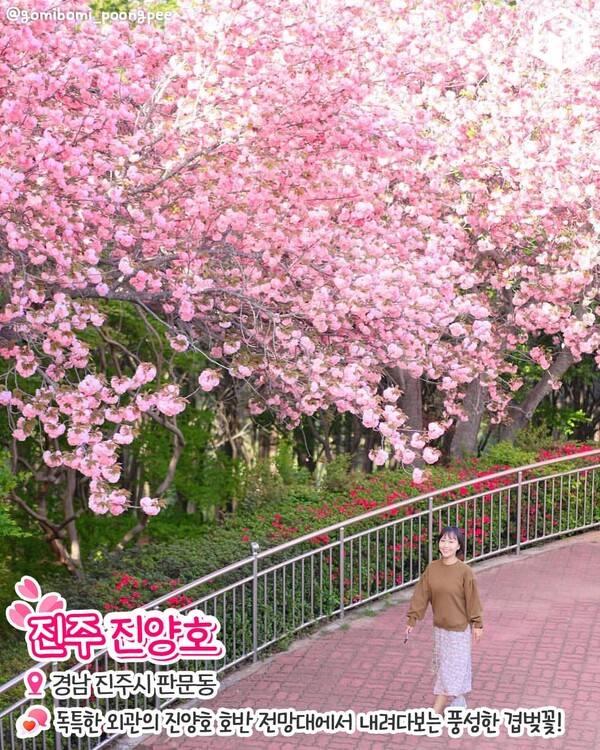 입구부터 풍성한 겹벚꽃을 볼 수 있는 진주 진양호 일대입니다. 진양호 호반 전망대 앞에서 가장 많은 겹벚꽃이 피어나는데요. 분홍빛과 하얀빛의 겹벚꽃이 한 나무에서 함께 피어 다채로운 색감의 겹벚꽃을 감상할 수 있습니다. 독특한 외관의 진양호 호반 전망대에 올라서면 진양호 호수를 한 눈에 담을 수 있죠.