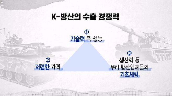 사실 우리가 흔히 K 방산의 경쟁력이라고 하면 3+1 이렇게 표현을 하거든요. 먼저, 기술력. 그러니까 우리 무기들의 성능이 뛰어나다는 그런 점이 있고, 그다음에 저렴한 가격. 저렴한 가격이라고 표현했는데 아까 보셨겠지만 사실 그렇게 저렴하진 않아요. 적당한 가격 받습니다.