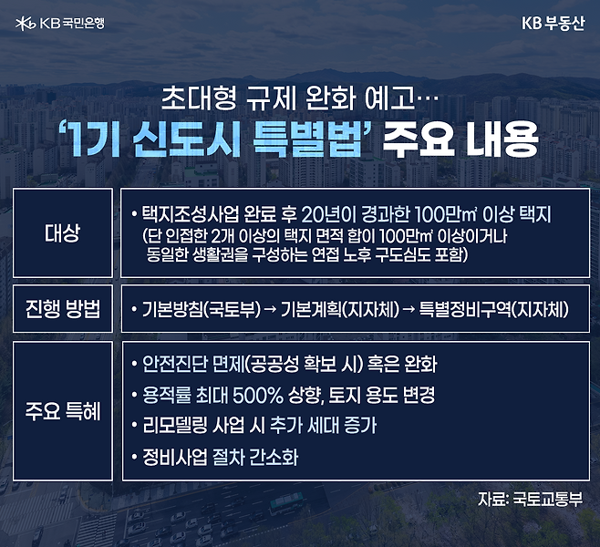 멀게만 느껴졌던 1기 신도시 정비사업이 가시화되고 있습니다. 지난달 7일, 정부는 ‘노후계획도시 정비 및 지원에 관한 특별법’을 공개하면서 1기 신도시를 비롯한 다수 지역에 정비사업과 관련된 특혜를 주기로 결정했는데요. 이에 직접적인 수혜를 입게 될 단지들이 주목받고 있는 상황입니다. KB부동산이 자세히 정리해봤습니다.