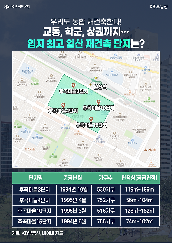 4개 단지는 후곡마을 단지 중에서도 입지적 장점이 뚜렷한 것으로 평가받고 있습니다. 일산역과 가장 가까이 위치한 데다가 일산 사교육의 중심인 후곡학원가와 인접해 있어 초·중·고 자녀를 둔 학부모 수요자에게 인기가 높은 단지인데요. 상권도 잘 조성돼 있고, 단지 사이에 넓은 면적의 녹지공원까지 마련돼 있어 주거 인프라가 뛰어난 편입니다. 현재 4개 단지의 총 가구수는 2,564가구에 달하며, 향후 통합 재건축이 완료된다면 일산을 대표하는 랜드마크 아파트가 탄생할 것으로 예상되고 있습니다.