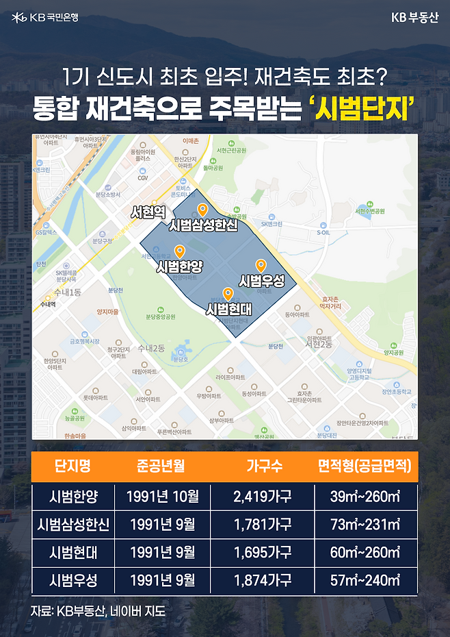 또한 시범단지는 교통, 학군, 편의시설 등 주거 인프라도 뛰어난 사업지입니다. 수인분당선 서현역과 인접한 역세권 단지인 데다가 서현초·중·고, 분당초 등 단지별로 학교 하나씩 품고 있는 알짜배기 단지죠. 만약 통합 재건축이 진행된다면, 한 단지 안에서 초·중·고 모두 통학이 가능한 원스톱 학군이 조성됩니다. 또한 분당중앙공원을 비롯해 분당호, 어린이공원 등 각종 휴게시설이 인접해 있고 서현역을 중심으로 상권도 잘 형성돼 있어 주거 만족도가 높은 단지입니다.