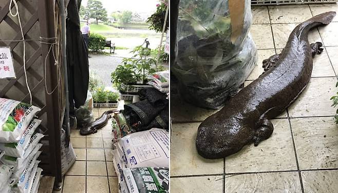 이 손님의 정체는 바로 일본의 천연기념물이자 멸종위기종인 '일본장수도롱뇽'이었습니다.