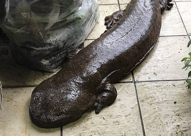 사진 속 도롱뇽은 몸길이가 약 80cm에 달하는 거대한 크기를 자랑했습니다. 폭우로 불어난 강물에 휩쓸려 육지로 올라온 것으로 추정됩니다.