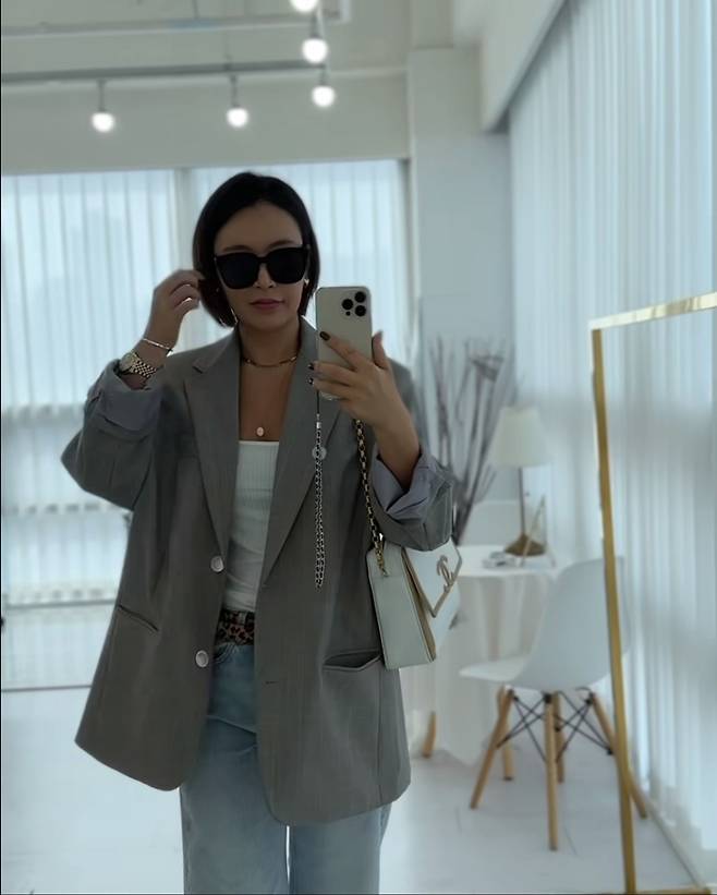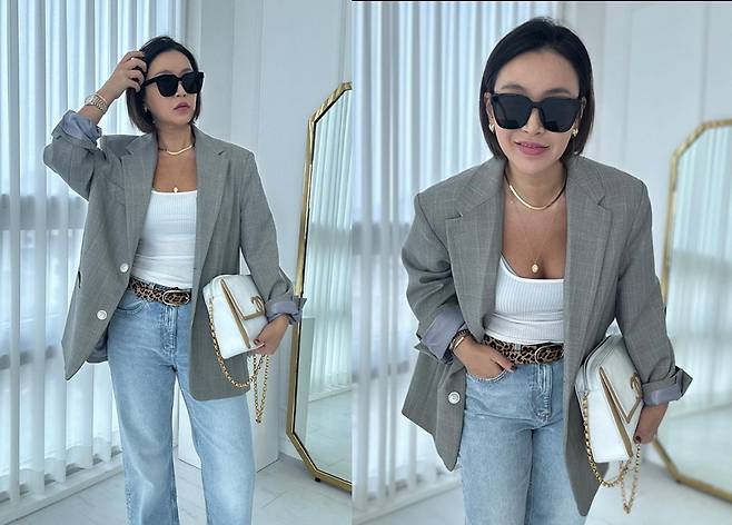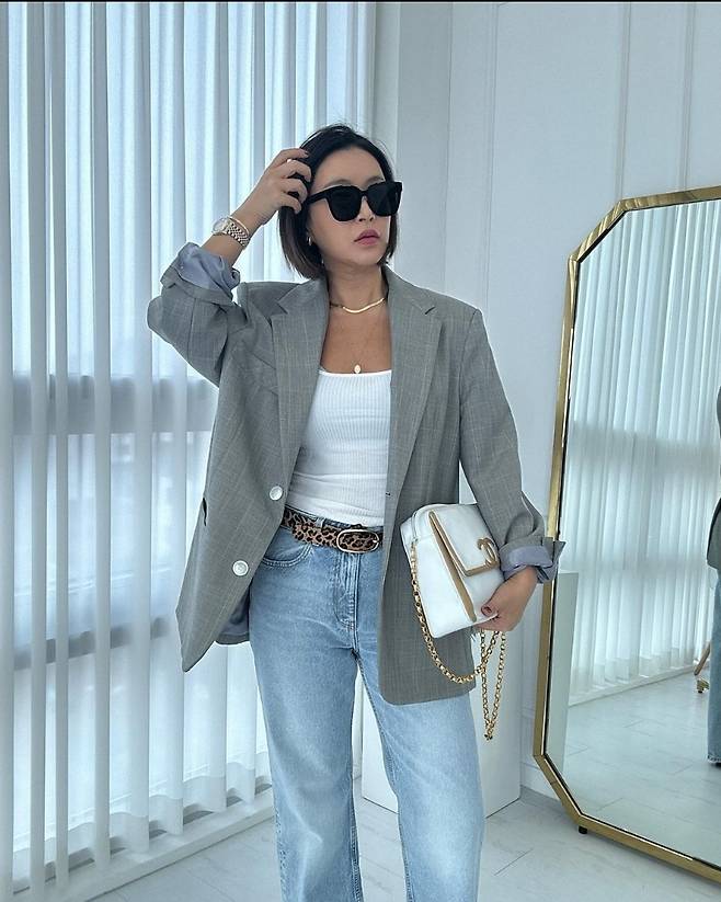 배윤정은 흰색 골지 티셔츠 위에 회색 재킷을 착용해 깔끔하고 스타일리시한 올드머니룩을 선보였습니다.