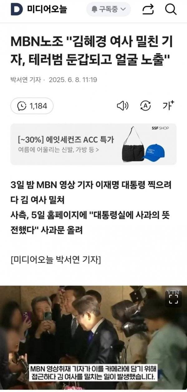3일 밤 MBN 영상 기자 이재명 대통령 찍으려다 김 여사 밀쳐 사측, 5일 홈페이지에 "대통령실에 사과의 뜻 전했다" 사과문 올려 [미디어오늘 ] MBN 영상 취재기자가 촬영 도중 김혜경 여사를 밀친 일이 인터넷상에서 비난받자, 전국언론노동조합 MBN지부가 “열심히 취재하던 기자가 마치 테러범인 양 둔갑되고 얼굴이 노출되고 과장된 스토리가 확산되는 것