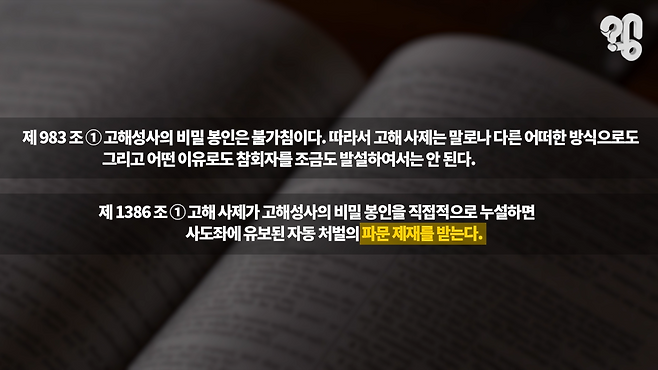 “무슨 그야말로 살인이 됐든 범죄 행위를 고해할 때 어떻게 되느냐 물론 사제는 종교 지도자로서 신자에게 자수를 하든지 여러 가지 그런 권유를 할 수는 있지만 고백한 사람이 안 한다고 해서 대신 신고하거나 그런 거는 절대 없습니다.”