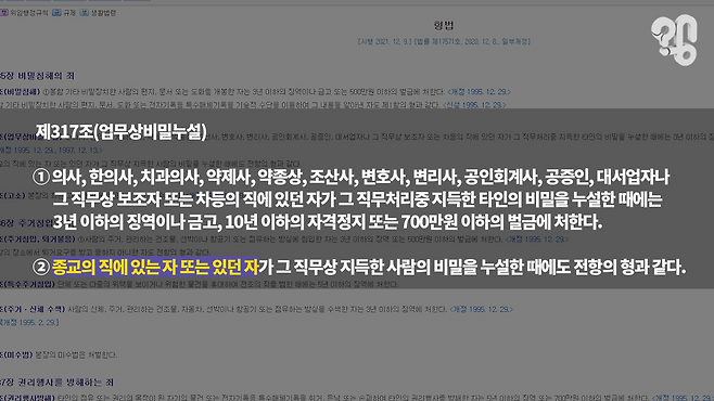 신부님이 고해성사를 통해 범죄 사실을 알게 되어도 수사기관에 신고하지 않는다고 해서 처벌받지는 않는다는 설명이다. 단, 두 가지의 예외가 있는데 비밀 유지의 수준이 아니라 범인 도피나 증거 은닉에 도움이 되는 수준이라면 범죄가 될 수 있다는 것과 범죄 사실을 알고 신고하지 않는 것만으로 죄가 되는 국가보안법의 경우 비밀을 유지하는 것만으로도 죄가 된다는 거다.