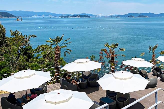 디스커버리카페에서는 탁 트인 바다와 거가대교, 이수도를 바라보면서 시간을 보낼 수 있는데요.