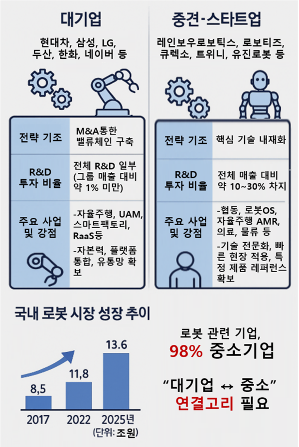 국내 로봇 시장의 생태계가 대기업의 '인수합병(M&A), 플랫폼 통합'과 중견·스타트업의 '연구개발(R&D) 집중, 기술특화' 전략으로 양분되고 있다. 휴머노이드와 피지컬 인공지능(AI)에 대한 글로벌 패권 경쟁이 치열해지는 가운데, 대기업과 스타트업 간의 협력 생태계 구축이 시급한 과제로 떠올랐다.