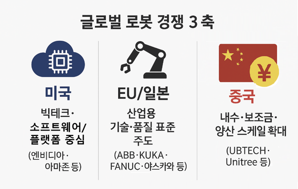이처럼 일본·독일은 '산업표준', 미국은 ‘빅테크·물류 연계 현장 확산’, 중국은 ‘양산 규모’ 등에서 각각 우위를 확보하며 글로벌 로봇의 패권 다툼을 주도하고 있다.