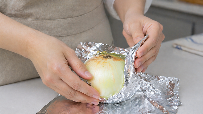 양파는 껍질이 있는 상태에서 낱개로 쿠킹포일에 감싸는 것이 중요하다. 여러 개를 한 번에 싸면 효과가 떨어질 수 있다.