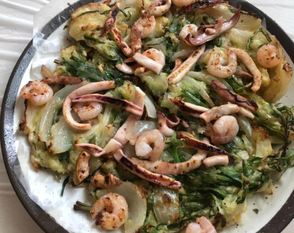 해물 육수를 활용한 반죽과 부추, 오징어, 홍합이 듬뿍 들어가 깊은 맛을 느낄 수 있어요.