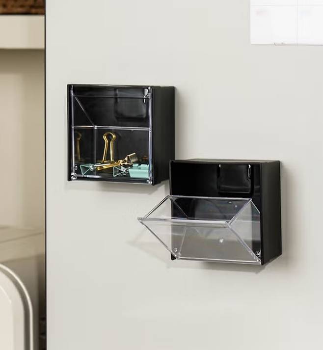 그럴 때 사용하기 좋은 물건이 바로 마그넷 스윙 케이스다. 이 작은 수납함은 앞면에 투명한 창이 달려있어 안에 있는 물건을 확인하기도 쉽고, 뒷면에는 강한 자석이 붙어있어 타공판이나 전자레인지, 냉장고 등 철제로 이뤄진 곳이라면 어디든지 착 달라붙어 공간 낭비를 줄일 수 있다.