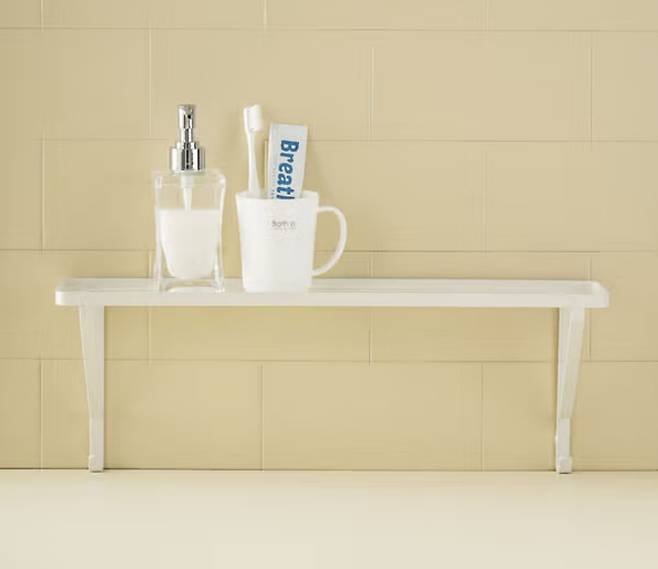이럴 대 사용하기 좋은 수납용품이 바로 타월 걸이 거치 선반이다. 별도의 설치 과정 없이 수건걸이 위에 올려놓으면 되는데, 벽이나 문에 부딪히는 부분에는 동봉된 폼 테이프를 붙여주기만 하면 된다.