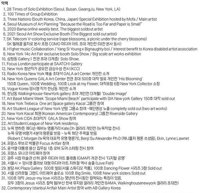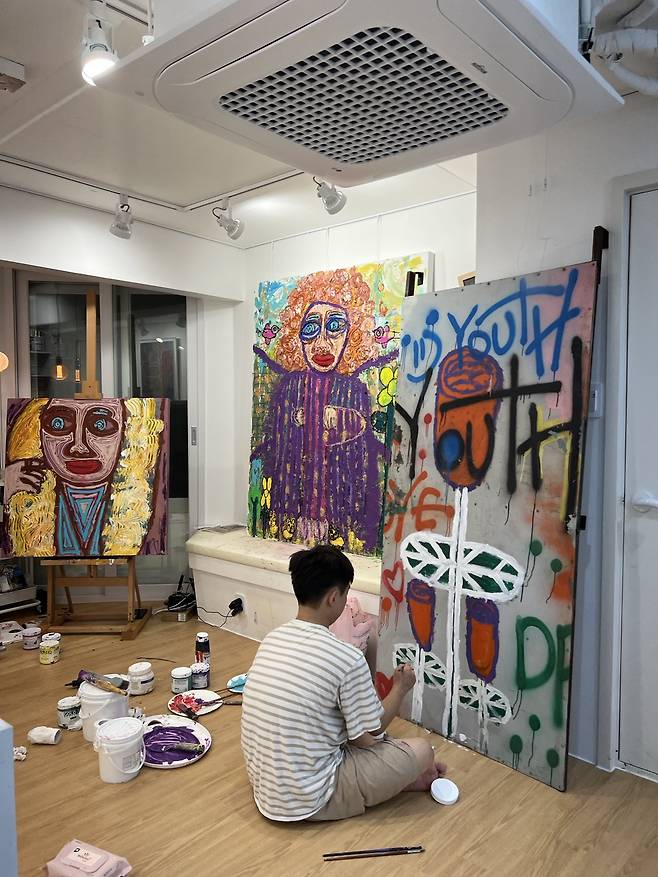 Yang Si-young, who draws pictures of her own soul that is not contrived, is an artist who embodies her pure intuition through fiercely staring at it straight ahead in an era when creativity is not appreciated without inspiration. The artist draws his paintings of objects as he observes and with his unique intuition and artistic energy rather than focusing on details or techniques. His age or profile may not be felt in his paintings at all if our prejudice is excluded in advance. In addition to figurative characters, the artist Yang Si-young freely expresses the external energy of flowers and cities he has experienced. The characteristics of the target characters are that they stare fiercely at the world without closing their eyes. Many characters are like the artist, Yang's mother, who always stands by his side. Like "Genre Yang Si-young" and "Yang Si-young's style," "his mother's efforts" to lead him to the path of self-individualization are in the one direction: It is to open a world where Yang Si-young as public goods can be recognized, and he stands tall as an "artist, Yang Si-young as an independent being" free from worldly prejudice. Usually, the artistic activities of autistic spectrum artists are inconvenient to communicate with others because their energy is concentrated in themselves, but Yang Si-young observes various people in new places and always challenges the "possibilities of his own world," which extends to 500 units without size limits.