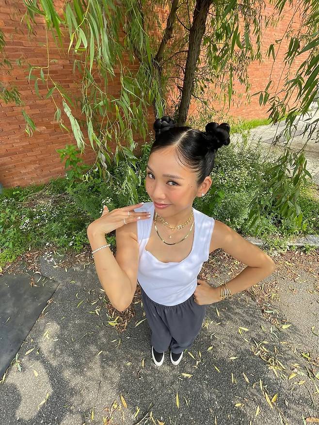 여기에 블링블링한 네크리스와 링, 그리고 양쪽으로 높게 올린 뿌까번 헤어스타일이 귀여움과 힙함을 한 번에 더했다.