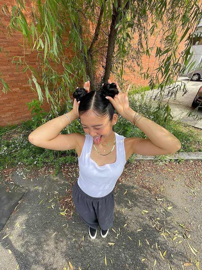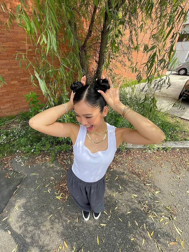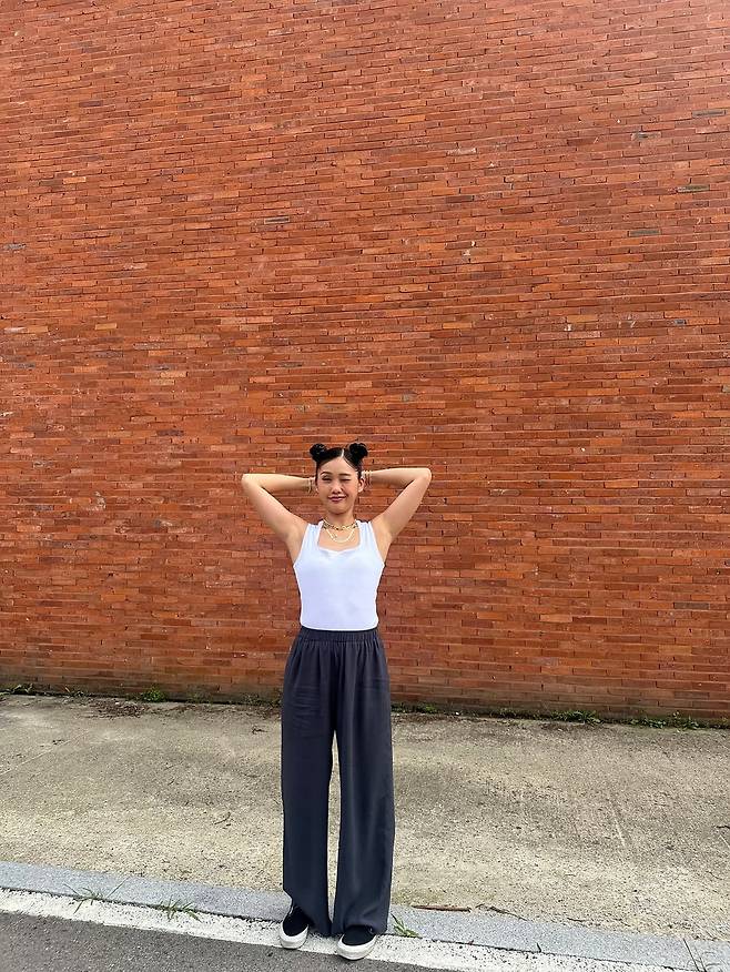 미미는 화이트 민소매 탑에 다크 그레이 와이드 팬츠를 매치한 꾸안꾸(꾸민 듯 안 꾸민 듯) 데일리룩으로, 편안하면서도 세련된 스타일을 완성했다.