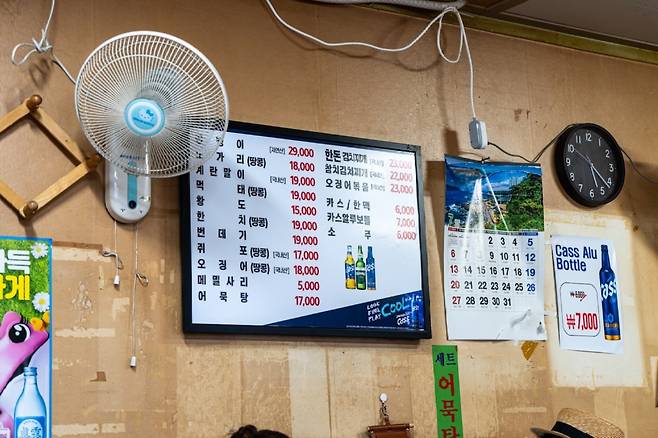 노포답게 간판을 보고 들어가면 먼저 차양 밑에 야장이 눈에 띈다. 막상 방문했던 날은 무더위가 심한 날이어서 실내로 들어갔지만 시원하게 냉방을 해주는 곳은 아니니 더운 날보다는 날씨 좋을 때 골목길에 테이블 펼쳐놓고 먹는 게 훨씬 좋을 듯하다.