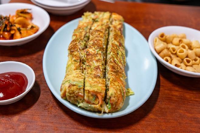 골뱅이는 기대했던 그대로 나왔다면 생각도 못 한 맛을 선사한 것이 계란말이다. 비주얼부터가 사뭇 다른 골뱅이 집 계란말이와 다르다. 아주 성의가 풀로 들어간 느낌이다. 너무 커서 처음에는 비주얼에 압도되었는데 한 입 먹어보고는 어라? 이게 뭐지? 알고 보니 계란말이에 졸깃한 것이 씹히는데 바로 오징어포를 잘게 썰어 넣으신 듯. 쫄깃하고 부드러운 계란말이가 아주 독특한 식감을 선사해서 기분이 좋았다.