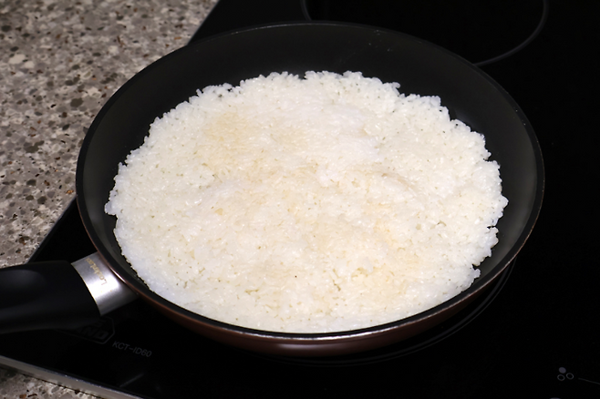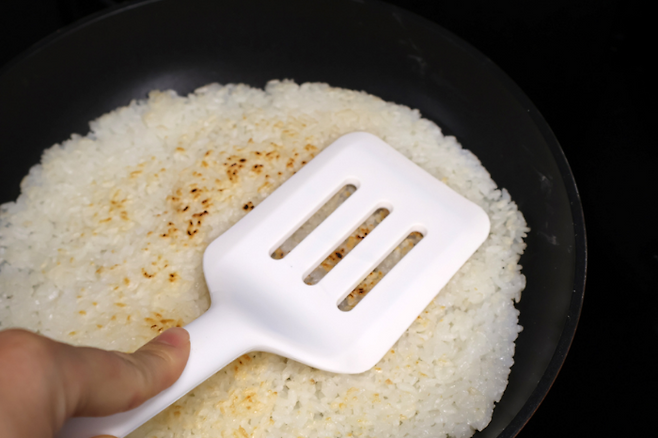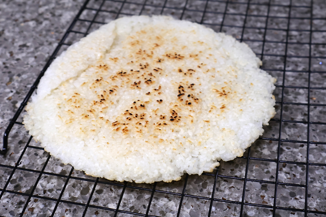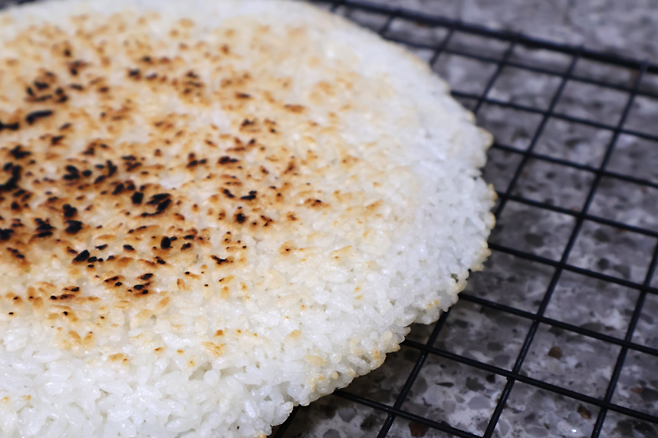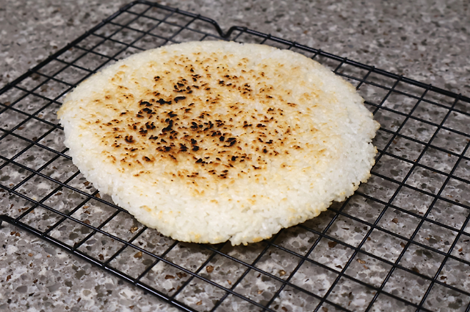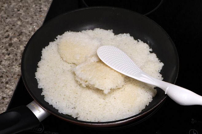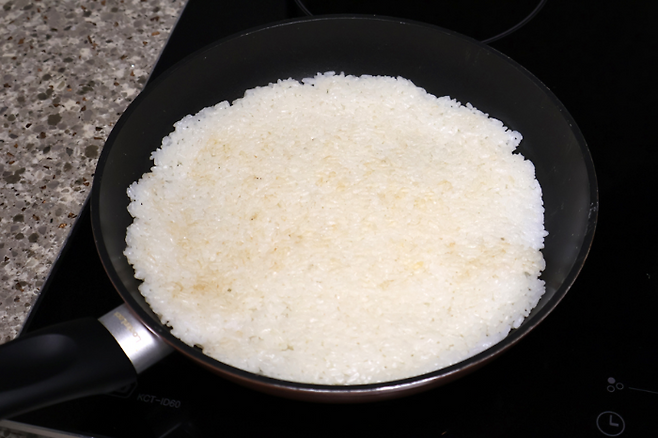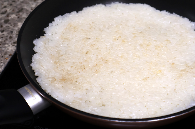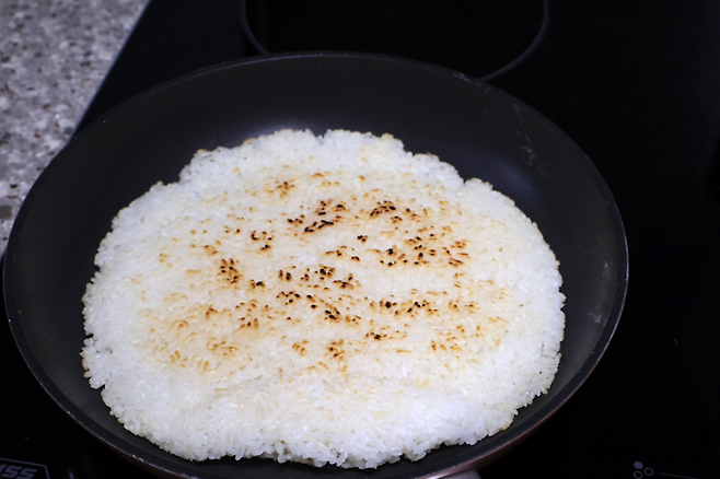 밥을 넓게 핀 뒤에 중불~강불 사이에서 구우면 돼요. 너무 불이 약하면 밥이 마르기만 하고 구워지지 않으니 적당히 센불에서 노릇하게 구우면 됩니다.