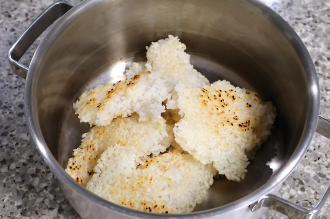 코팅 후라이팬을 사용하면 더 쉽게 누룽지 만들기 할 수 있어요.