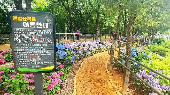 봄이면 벚꽃이, 여름이면 수국이 흐드러지게 피는 길 위에서, 황토와 마사토가 어우러진 맨발 길을 따라 천천히 걸어보자.
