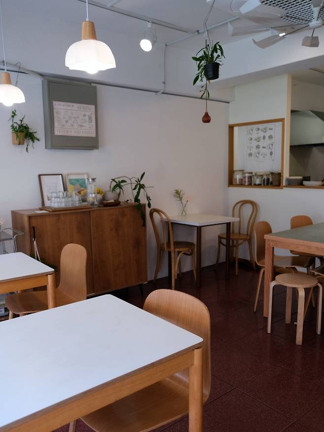 가장 중요했던 과제는 건너편 큼지막한 정육점 간판을 가리는 일이었어요. (웃음) 가끔은 의도적으로 이 자리를 택한 것 아니냐는 오해를 사기도 하는데요, 정육점 사장님과는 정말 잘 지내요. (웃음) 또 계절마다 제철 채소를 그린 포스터를 직접 만들어 곳곳에 걸었어요. 인터넷에 제철 음식 포스터를 검색하면 주로 해산물, 생선이 나오더라고요. 채소, 과일 위주로 직접 만들 수밖에 없었어요. ‘건강한 음식을 만드는 곳이구나’라고 생각할 수 있도록 우드와 초록, 베이지색 등 눈이 편안해지는 색감과 소재의 가구를 들였고요.