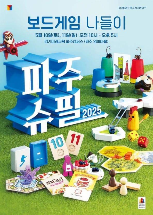 5월 10일부터 11일까지 경기미래교육 파주캠퍼스에서 열리는 파주슈필 2025는 신작 보드게임 체험, 보드게임 대회, 가족·친구와 함께하는 게임 라운지, 그리고 파주 출판단지 산책까지 다양한 프로그램이 준비된 축제예요.