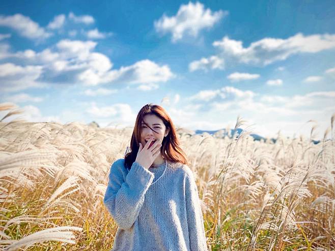 첫 번째 사진에서 정윤혜는 억새밭을 배경으로 따뜻한 회색 니트 스웨터를 착용해 가을의 포근함을 강조했다. 루즈한 핏의 니트는 편안하면서도 자연스러운 분위기를 연출하며, 배경과 조화를 이루어 감각적인 계절감을 드러낸다. 심플한 스타일링이지만, 소재와 색감 선택이 돋보인다.