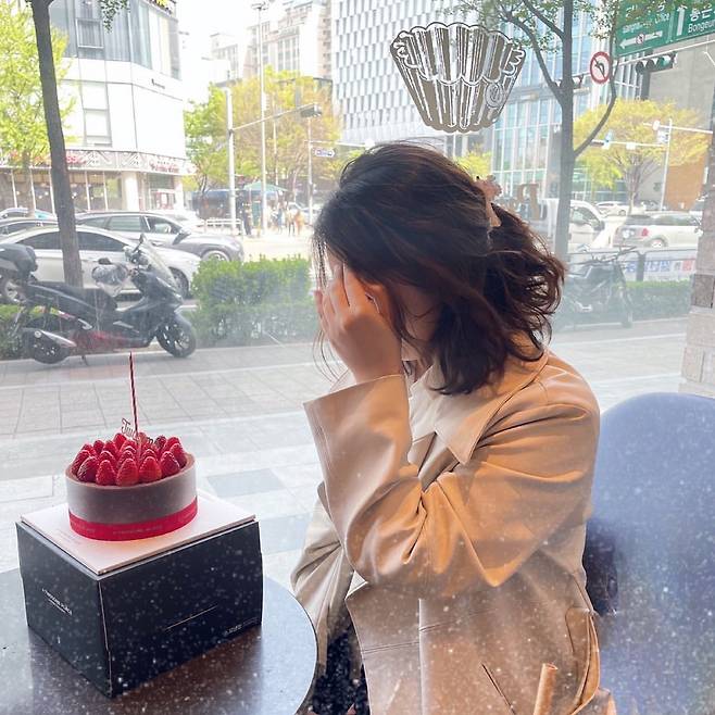 네 번째 사진에서 정윤혜는 크림색 트렌치코트를 착용해 세련된 분위기를 자아냈다. 자연스럽게 묶은 헤어스타일과 함께, 케이크가 놓인 테이블은 우아하면서도 따뜻한 감성을 더한다. 도시적인 배경과 어우러져 고급스러운 무드를 완성했다.