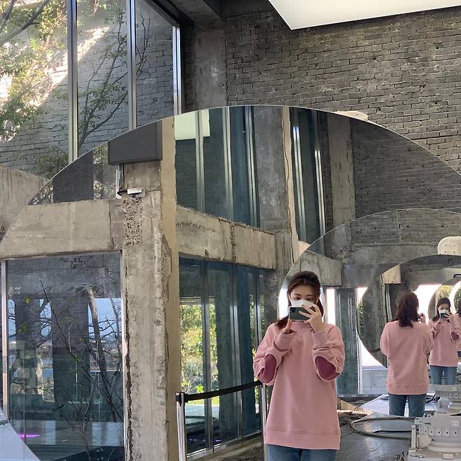 두 번째 사진에서는 핑크 톤의 스웨트셔츠와 데님 팬츠를 매치해 발랄하고 캐주얼한 분위기를 연출했다. 거울을 활용한 독특한 구도는 그녀의 스타일에 재미를 더하며, 벽돌과 유리로 구성된 공간과 대비되어 더욱 돋보인다. 이 룩은 일상적이면서도 사랑스러운 이미지를 강조한다.