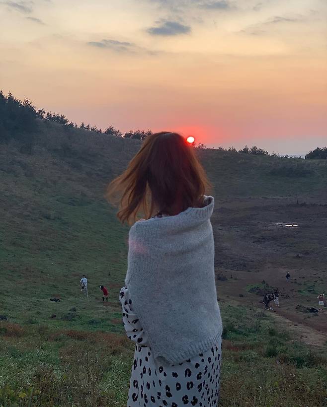 세 번째 사진에서는 해질녘 풍경 속에서 니트 숄과 도트 패턴 원피스를 매치해 로맨틱한 무드를 연출했다. 숄은 여리여리한 실루엣을 강조하며, 따뜻한 색감의 배경과 어우러져 감성적인 느낌을 배가시킨다. 소품 없이도 자연과 함께 완성된 스타일링이 돋보인다.