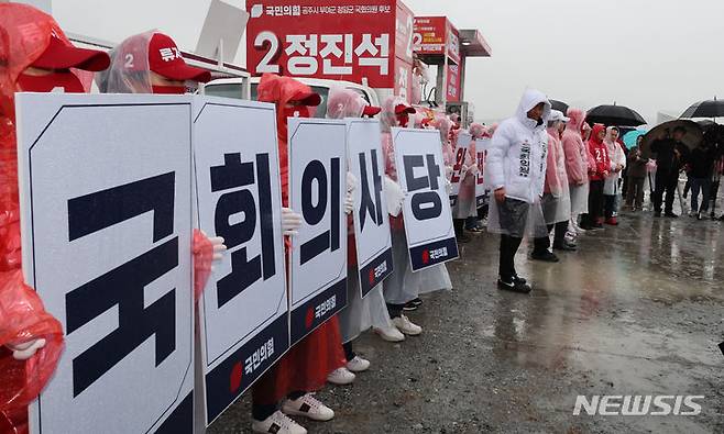 [세종=뉴시스] 강종민 기자 = 제22대 국회의원 선거 공식선거 운동이 시작된 28일 세종시 국회세종의사당부지에서 열린 국민의힘 충청권 결의대회에 '국회의사당 세종시 완전 이전' 피켓이 등장해 눈길을 끌고 있다. 2024.03.28. ppkjm@newsis.com