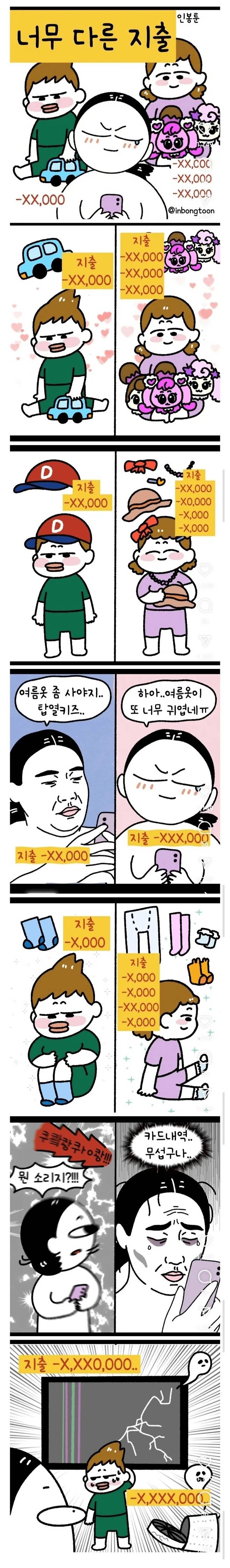아들과 딸을 키울 때 부모 지갑이 열리는 방식이 이렇게 다를 수 있을까. 최근 한 온라인 만화가가 그린 ‘아들·딸 양육 지출 비교’ 만화가 네티즌 사이에서 큰 웃음을 주고 있다.