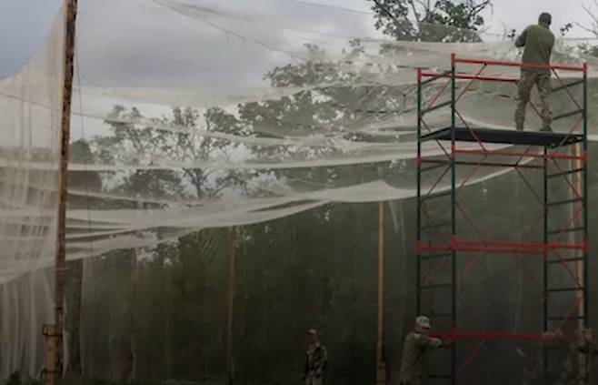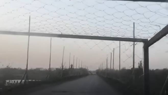 우크라이나군은 군사 검문소와 포병 진지를 지나는 길목에 어망 회랑을 설치해 두었는데 도로를 지나를 차량 주위를 어망으로 둘러싸는 형태입니다.