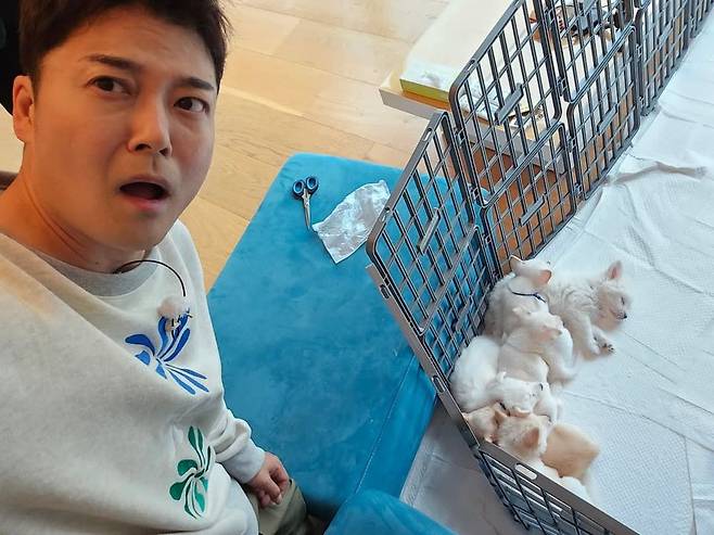 함께 포착된 배경도 흥미롭다. 푸른 벨벳 쿠션 위에 앉은 전현무 옆으로 강아지 우리 안에서 새근새근 잠든 강아지들의 모습이 보는 이들로 하여금 절로 미소를 짓게 한다. 수의용 가위와 패드, 청결하게 정돈된 공간은 이른바 ‘강아지 유치원’의 현실 버전 같은 느낌을 자아내며, 이 모든 분위기를 자연스럽게 소화해내는 전현무의 존재감도 돋보였다.