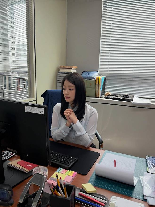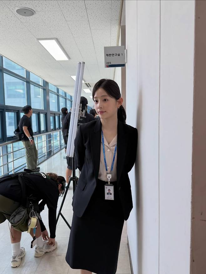 채서안은 ‘법원’이라는 격식 있는 배경에 완벽하게 어우러지는 단정하고 전문적인 오피스 스타일링을 선보였습니다.
