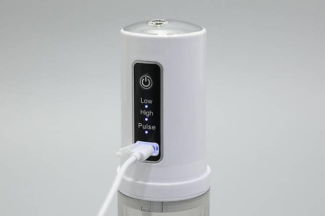 비즈 휴대용 구강세정기 BZ-DT10를 사용하려면 우선 충전을 해야 한다. 본체 전면 충전 포트에 케이블을 연결하면 세 개의 LED가 차례로 점멸하며, 충전이 완료되면 LED 세 개가 모두 켜진 상태가 된다.