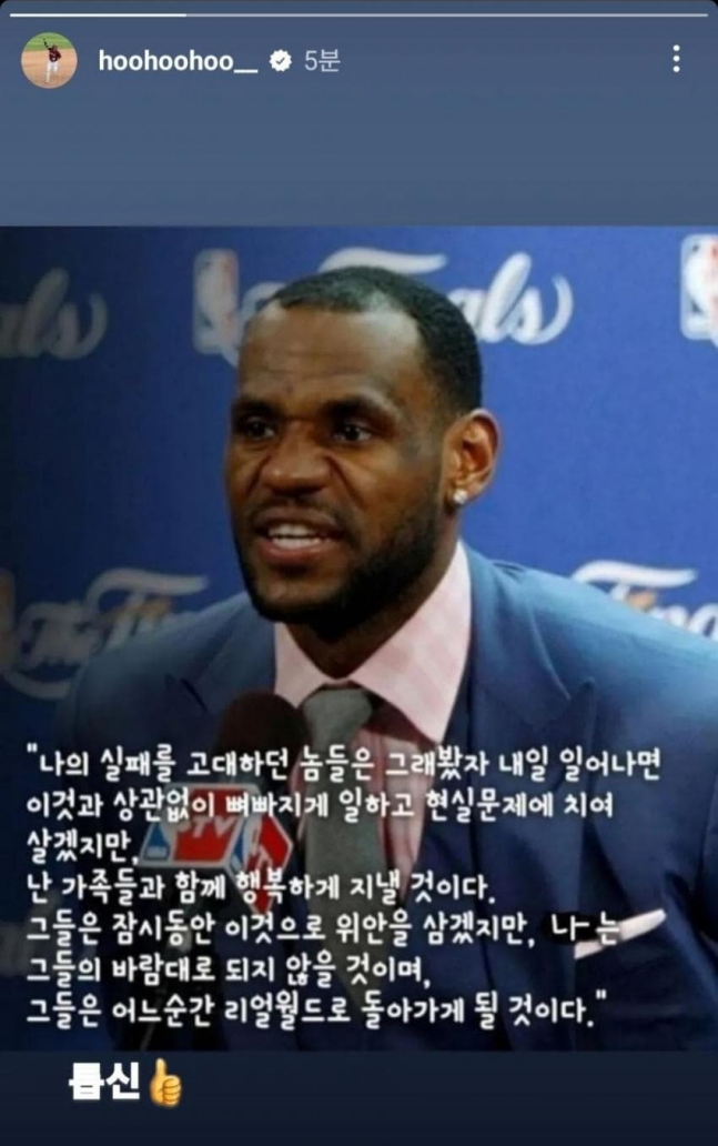 이정후는 26일 개인 SNS에 NBA 슈퍼스타 르브론 제임스(LA 레이커스) 사진을 게재했고, "릅신"이라는 문구를 달았다. 사진에는 당시 마이애미 히트 소속이었던 르브론이 지난 2010-2011시즌 댈러스 매버릭스와의 파이널 패배 후 전한 인터뷰 내용이 포함되어 있었다.