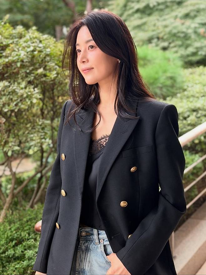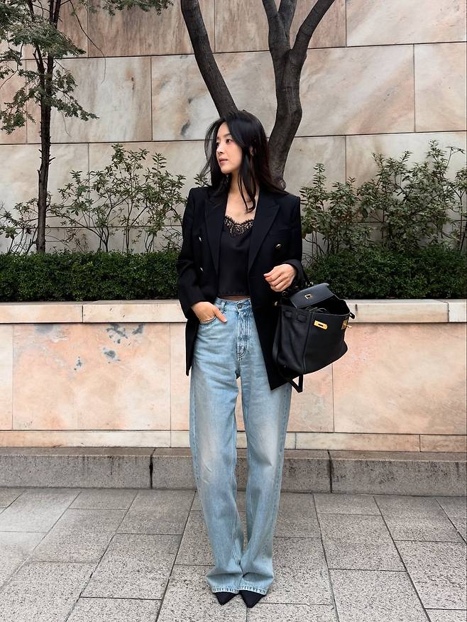 블랙 더블 브레스트 자켓에 레이스 디테일이 들어간 실크 슬리브리스를 매치해, 단정하면서도 은근한 페미닌 무드를 완성했죠.