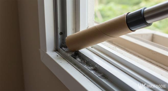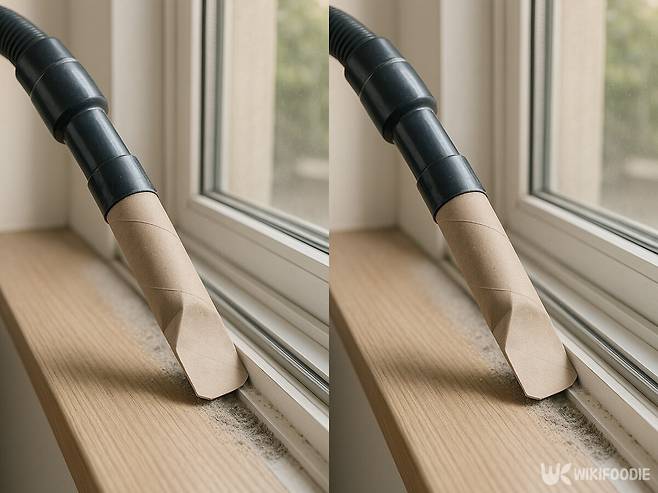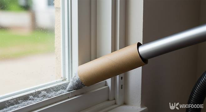 3. 청소기를 켠 상태에서 휴지심 끝을 창틀 틈에 댄다. 먼지가 흡입되는 것을 확인하며 천천히 움직인다.