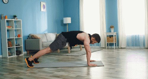 플랭크 자세에서 시작해 엉덩이를 들어 올려 다운도그 형태로 전환합니다. 그 상태에서 한 손을 뻗어 반대쪽 발을 터치하며 몸의 대각선 연결을 만듭니다. 다시 플랭크로 돌아온 뒤 반대쪽도 같은 흐름으로 이어갑니다. 동작 사이마다 중심이 무너지지 않도록 복부에 힘을 유지합니다.