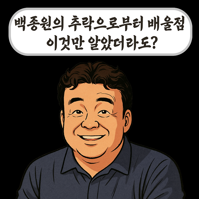 백종원으로부터 우리는 배워야 한다. 사람은 정말 잘 나가기 시작하면, 그때가 가장 위험하며, 곧 그 자리에서 내려올 준비를 해야한다는 사실을 말이다. 성공은 마치 독과 같아서, 적당히 마시면 자신감을 주지만 과도하게 섭취하면 판단력을 흐리고 현실 감각을 잃게 만든다. 사물이나 형세는 고정불변인 것이 아니라 흥망성쇠를 반복하게 마련이라는 뜻도 있고, 어떤 일을 함에 있어 지나치게 욕심을 부리지 말라는 뜻도 담겨 있다. 백종원의 추락은 바로 이 욕심 때문일 수 있다. 방송인으로서의 영향력과 기업인으로서의 이익을 동시에 극대화하려다가 두 영역 모두에서 신뢰를 잃게 된 것이다.
