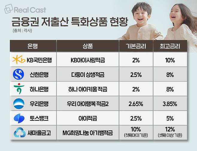 은행권에서 사회적인 문제로 대두되고 있는 저출산 문제를 해결하기 위해 아이와 관련된 특화 상품들을 판매 중에 있습니다. 기준금리가 2.5%까지 인하하면서 5%가 넘는 상품을 찾기 어려운 가운데 아이와 관련된 상품 중에는 최고 연 12% 금리 상품도 있는데요. 리얼캐스트에서 금융권 고금리 상품을 살펴봤습니다.
