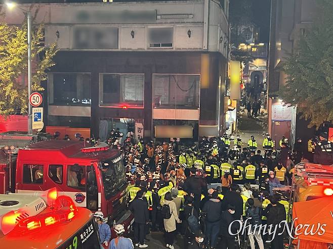 | ▲ [오마이포토] 이태원 해밀턴호텔 인근에 모여있는 소방·경찰 |
