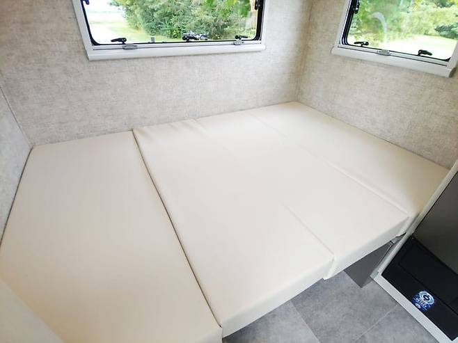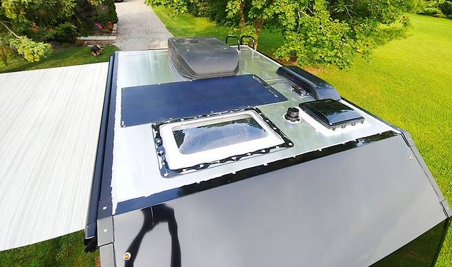 알루미늄 프레임 벤치 내부는 수납공간으로 활용되며, 5인치 두께의 마린 비닐 쿠션을 적용했다. 실내 높이는 약 2,032mm로 성인도 서서 이동할 수 있으며, 천창과 측면 창을 통해 개방감을 높였다.