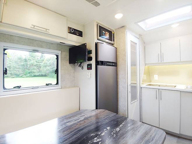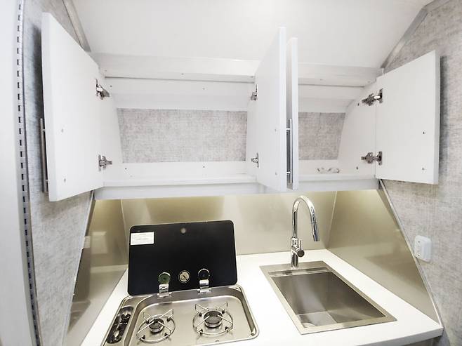 실내는 한정된 공간을 최대한 활용하도록 설계됐다. 전면에는 스테인리스 2구 가스레인지와 깊이 25cm의 싱크볼, 냉장고가 갖춰진 주방을 배치했다. 재구성 가능한 수납장과 오버헤드 캐비닛은 조리도구와 식기를 깔끔하게 보관할 수 있다.