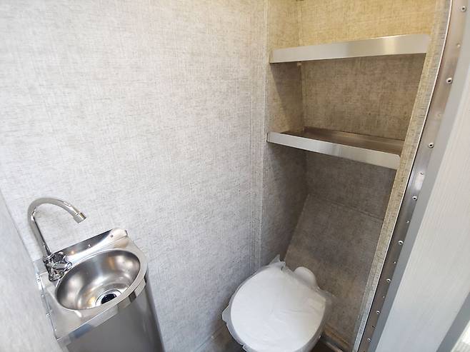 주방 옆 소형 욕실은 변기와 스테인리스 세면대, 온수기, 수납 선반이 기본 제공되며, 샤워 시설은 옵션으로 선택할 수 있다. 후면부의 U자형 다이넷은 낮에는 식사와 휴식 공간으로, 밤에는 1,320×1,980mm 크기의 침대로 변환된다.