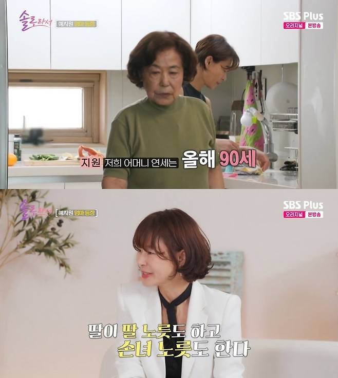 최근 SBS Plus·E채널 '솔로라서'를 통해서는 90세 어머니와 함께하는 일상을 공개했다. 예지원은 어머니는 37년생으로 올해 90세라며 집에 거의 안 계실 정도로 약속이 많다고 밝혔고, 두 사람은 각자 스타일대로 아침을 차려 먹고 부엌 인테리어를 두고 의견 충돌도 벌이는 등 현실 모녀의 유쾌한 케미를 보여줬다.